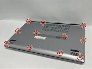 Используйте отвертку JIS #1, чтобы удалить одиннадцать винтов длиной 6.7 мм с нижнего покрытия.