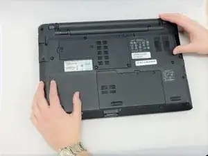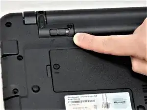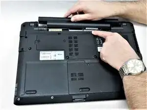 Найдите зажим, который выбрасывает аккумулятор (в правом верхнем углу), и сдвиньте его влево, чтобы аккумулятор мог выйти.
