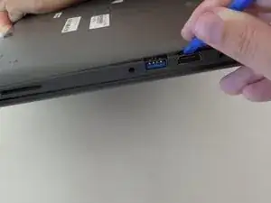 Вставьте пластиковый инструмент для открывания в углубление задней панели, расположенной над портом HDMI.