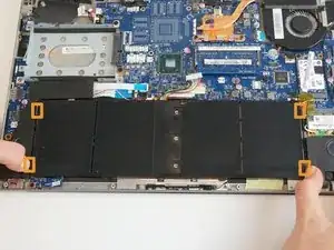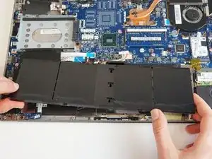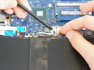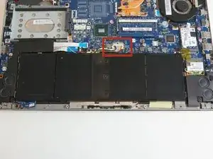 Отсоедините ленточный кабель, соединяющий аккумулятор с материнской платой, аккуратно потянув его наружу.