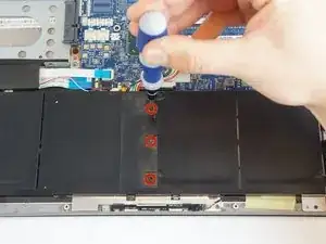 Выкрутите три винта Phillips #00 длиной 4,5 мм, крепящих аккумулятор к материнской плате.