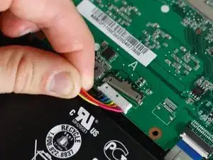 Отключите аккумулятор от материнской платы, осторожно потянув проводки вниз к аккумулятору до освобождения разъема.
