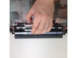 Держа пластиковый рычажок, аккуратно отделите аккумулятор от нижней панели ноутбука.