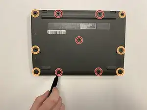 Используйте отвертку JIS #00, чтобы снять 11 винтов на нижней стороне ноутбука.