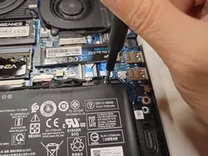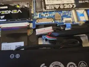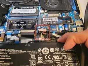 Поднимите аккумулятор вверх и от материнской платы, чтобы обнажить соединительный кабель.