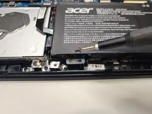 Отверткой Phillips #0 выкрутите два винта, фиксирующие аккумулятор к верхней части корпуса.