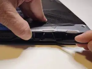 Прижмите большим пальцем решётку вентиляции ноутбука вверх и используйте лопатку, чтобы отделить нижнюю крышку от верхней части корпуса.