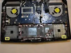 Отключите ленточные кабели в нижней части ноутбука, чтобы освободить больше места и поднять клавиатуру вверх и в сторону.