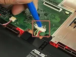 Используя пластиковый инструмент для открытия, осторожно отодвиньте зажим соединителя от аккумулятора, чтобы отсоединить кабель.