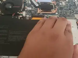 Сдвиньте металлический замок, который соединяет батарею с материнской платой, назад (вправо). Затем прямо вытащите белый разъем из гнезда на материнской плате.
