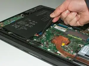 Используя лопатку, аккуратно отсоедините кабель питания, соединяющий батарею с остальной частью ноутбука.