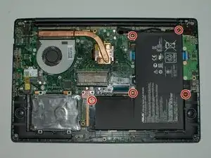 Удалите пять серебристых винтов Phillips #0 размером 4 мм, удерживающих батарею в ноутбуке.