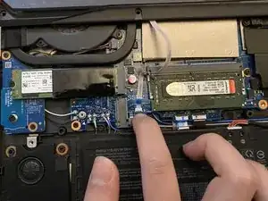 Поднимите серебристую защёлку, фиксирующую разъём аккумулятора.