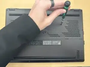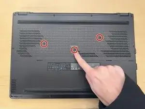 Используйте отвёртку Phillips #0, чтобы выкрутить три винта длиной 6,0 мм, расположенные в центре нижней части ноутбука.