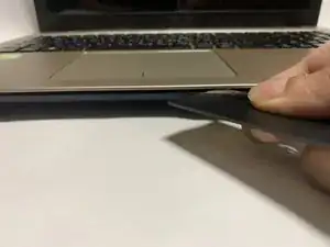 Используйте инструмент для подъема между клавиатурой и нижними пазами, чтобы частично снять заднюю часть ноутбука.