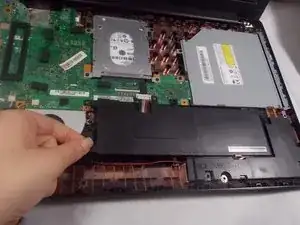 Поднимите аккумулятор вверх и полностью извлеките его из ноутбука.