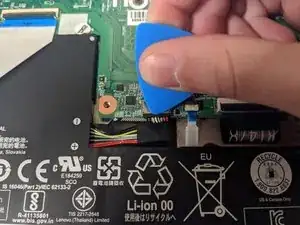 Снимите черную ленту, закрывающую разъем, затем с помощью инструмента лопатки аккуратно отключите аккумулятор от материнской платы.