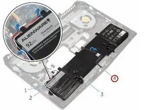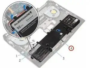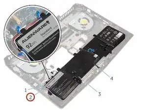 Обратите внимание на прокладку переднего кабеля подсветки AlienFX и аккуратно оторвите кабель от аккумулятора.