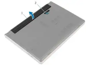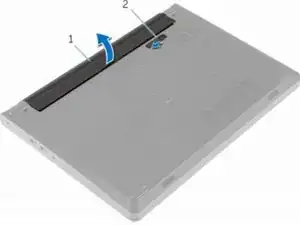 Сдвиньте фиксатор освобождения аккумулятора в положение «открыто».