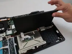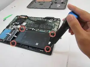 Снимите четыре винта Phillips #0, крепящих аккумулятор к сборке клавиатуры.