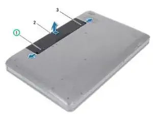 Сдвиньте защелку освобождения аккумулятора в сторону.