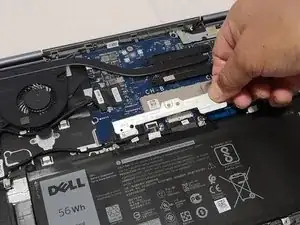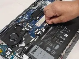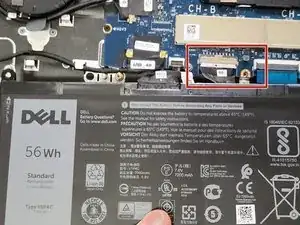 Потяните за язычок на кабеле аккумулятора, чтобы отключить его от материнской платы.