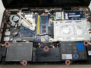 Выкрутите два винта в центре снизу аккумулятора, два винта в верхних внешних углах и один винт в верхней центральной части.