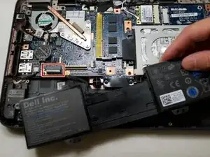 Наконец, отсоедините белый разъём питания, который соединяет аккумулятор с материнской платой (для удобства на фотографии разъём обведён красным). Теперь извлеките аккумулятор из устройства и отложите в сторону.