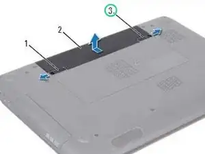 Переместите защелку освобождения аккумулятора и защелку блокировки аккумулятора в положение разблокировки.
