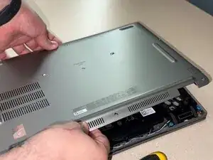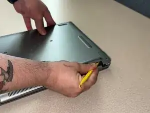 Переверните ноутбук вверх дном и удалите все восемь винтов с крестовой головкой, которые крепят нижнюю крышку.