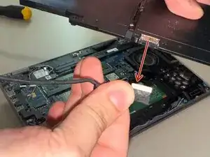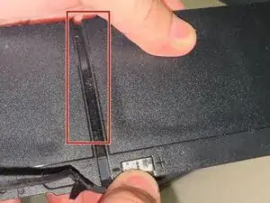 Переверните аккумулятор и удалите ленту, удерживающую его кабель, чтобы отсоединить его.