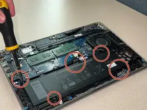 Удалите все пять винтов с крестовой головкой, которые крепят аккумулятор.