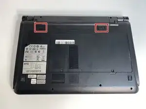 Чтобы удалить аккумулятор, оттяните правый переключатель разблокировки аккумулятора с пружиной, одновременно сдвигая аккумулятор от ноутбука.