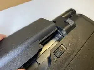 Сдвиньте левый переключатель разблокировки аккумулятора в положение разблокировки (красный цвет виден). Это также указано значками блокировки/разблокировки рядом с переключателем.