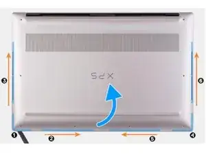 Начиная с нижнего левого угла, используйте пластиковую лопатку, чтобы поддеть нижнюю крышку в направлении стрелок и освободить её от корпуса подставки для рук и клавиатуры.