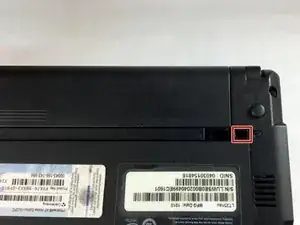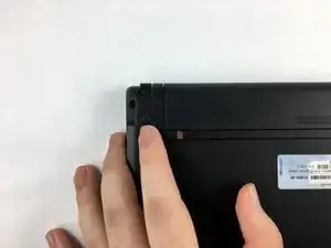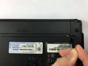 Закрыв крышку нетбука, переверните его и сдвиньте защёлку в верхнем левом углу устройства влево.