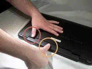 Удерживая фиксатор в положении разблокировки, вытяните аккумулятор, отвлекая его от ноутбука.