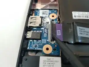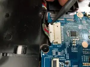 Отключите два ленточных кабеля, подключённых к материнской плате: с помощью острого конца лопатки поднимите крышки пластиковых разъёмов, затем осторожно извлеките ленточные кабели вручную.