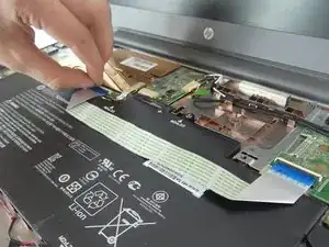Снимите ленточный кабель, проходящий над аккумулятором, поднимая пластиковые защёлки и вытягивая кабель.