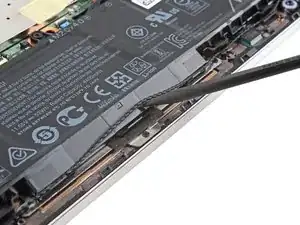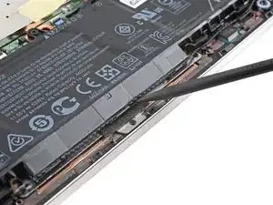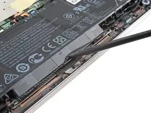 Проведите медиатором вокруг правого угла и до середины боковой панели EliteBook, чтобы освободить защёлки, удерживающие нижнюю крышку.