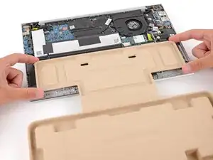 Закройте картонную подложку, чтобы старый аккумулятор был надёжно закрыт, и отложите в сторону.