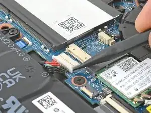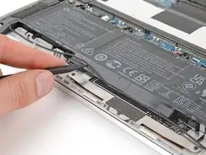 Используйте лопатку или пальцы, чтобы поднять кабель динамика из его креплений на нижнем крае аккумулятора.
