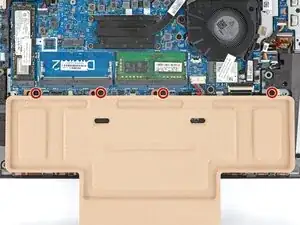 Используйте крестовую отвёртку, чтобы вынуть четыре винта длиной 4,5 мм, удерживающих верхний край аккумулятора.