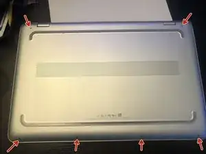 С помощью отвертки с головкой Phillips #00 открутите 4 винта из полости резиновой полоски. Может быть полезно использовать пинцет, чтобы их извлечь, так как они утоплены под алюминиевой задней панелью.