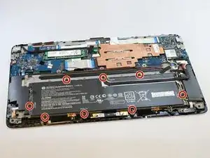 Используйте отвертку Phillips #00, чтобы выкрутить семь 3 мм винтов вокруг аккумулятора.
