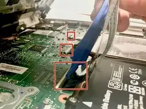Существует 3 шлейфа (черный, белый и медный), соединяющие компьютер с клавиатурной панелью. Отключите 3 шлейфа с помощью пластикового инструмента, поднимая защелки, удерживающие каждый шлейф на месте.