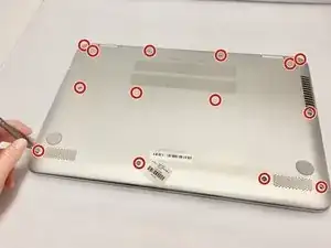 Удалите четырнадцать винтов длиной 7 мм с помощью отвертки Phillips #0 с нижней части ноутбука.