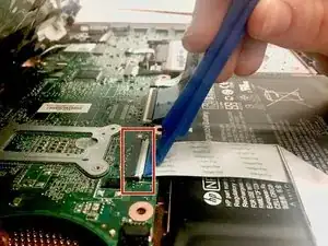 Удалите толстый белый шлейф, покрывающий аккумулятор, с помощью пластикового инструмента, поднимая защелки на каждом конце.