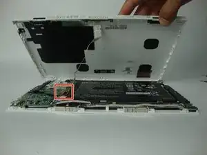 Снимите полупрозрачную желтую ленту, закрывающую разъём аккумулятора на материнской плате.