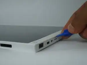 Используя синий пластиковый инструмент для вскрытия или плоский лезвийный инструмент, аккуратно вставьте лезвие между панелью дисплея и осторожно сдвиньте, чтобы приподнять сборку.